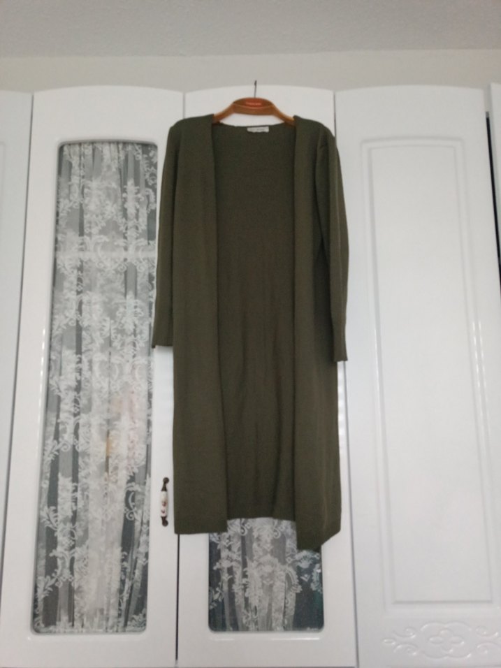 Uzun kollu, salaş kesim ve drapeli tasarıma sahip haki kadın hırkası. Yumuşak kumaştan, günlük rahat kullanıma uygun.