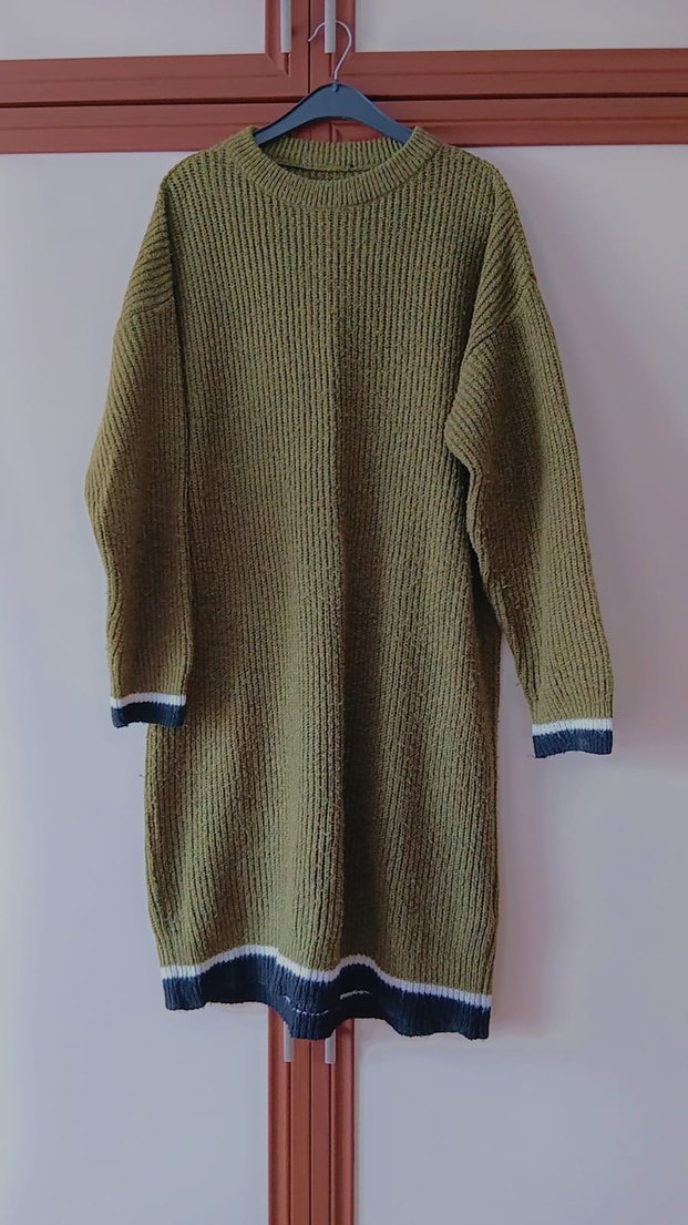 Salaş kesim, yuvarlak yaka ve uzun kollu haki renk triko kazak, uçlarında gri ve beyaz şerit detaylı, uzun ve rahat bir tasarıma sahiptir.