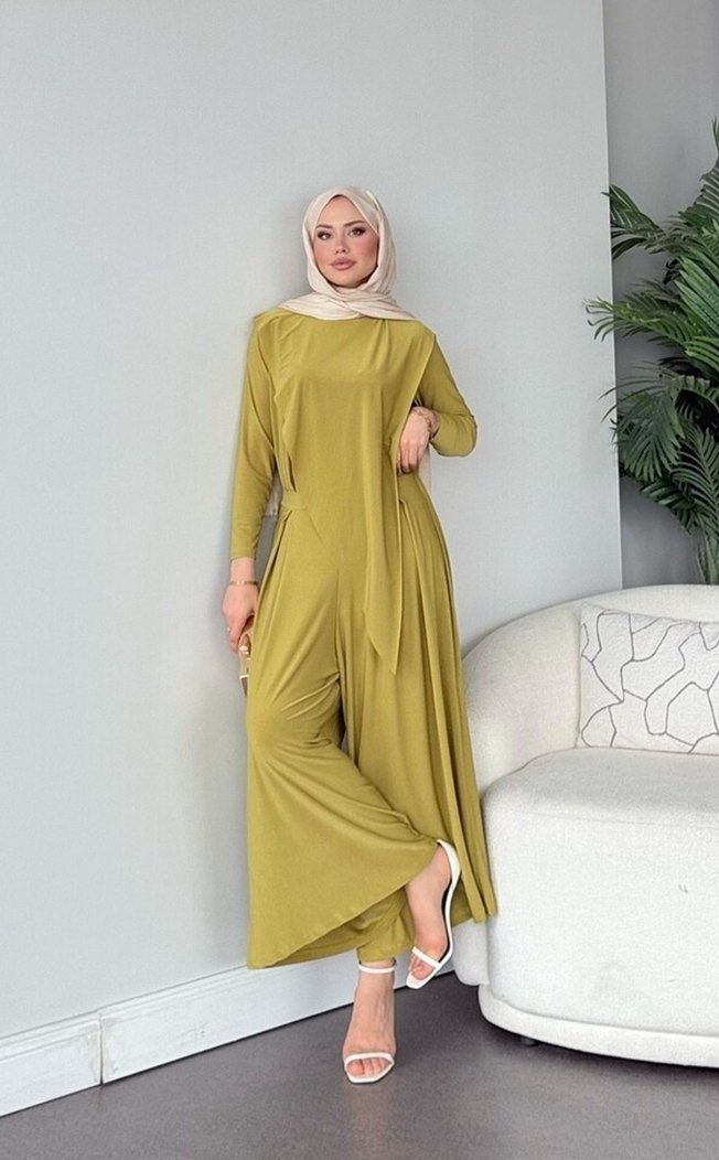 Uzun kollu, salaş kesim haki tulum, ince ve ipeksi kumaştan. Drapeli minimalist tasarımıyla günlük kullanıma uygundur. Tulum değildir seçeneklerde tulum olarak çıkıyor ikili takımdır etek formunda pantolon ve bluzdur esneklik kralı kumaştır bir beden 36 44 uyumludur iki beden 46 48 uyumludur