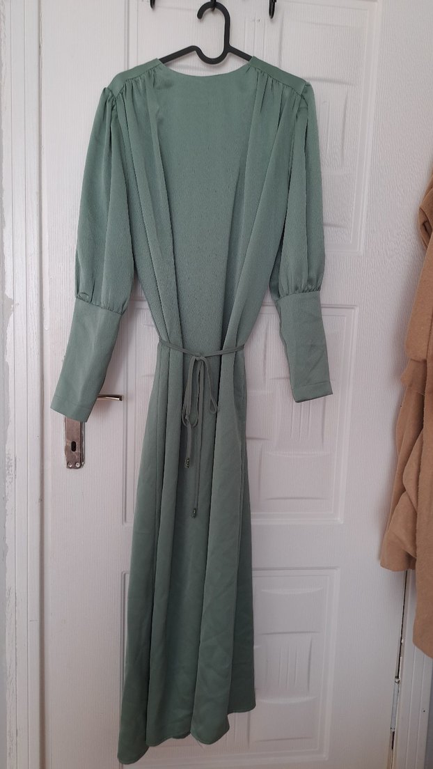 uzun kollu, notched lapel yakalı ve salaş kesimli, satenimsi kumaştan yapılmış uzun elbise. Minimalist ve modern klasik tarzda, günlük kullanım için uygun.