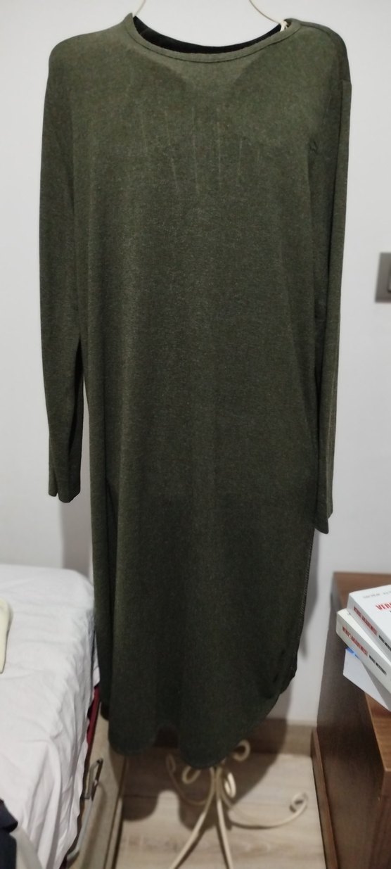 Uzun kollu, salaş kesim triko elbise. Yumuşak yün kumaştan yapılmış, haki renkte, rahat ve günlük kullanım için uygun.