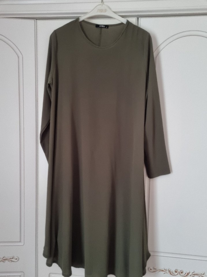 Salaş kesim, uzun kollu ve yuvarlak yakalı uzun tunik.Haki renkte. Minimalist, sade tarz, günlük kullanım için uygundur.