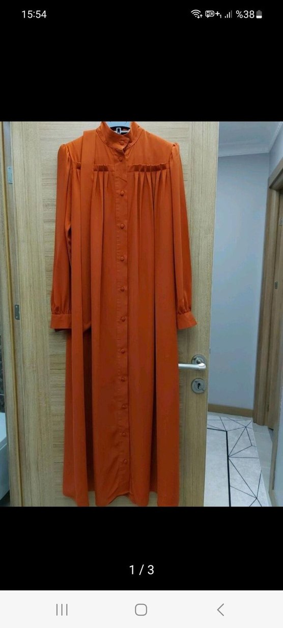 Kadın tunik, uzun boy, salaş kesim ve drapeli tasarıma sahiptir. Uzun kollu ve kiremit tonunda, krep kumaştan yapılmıştır.