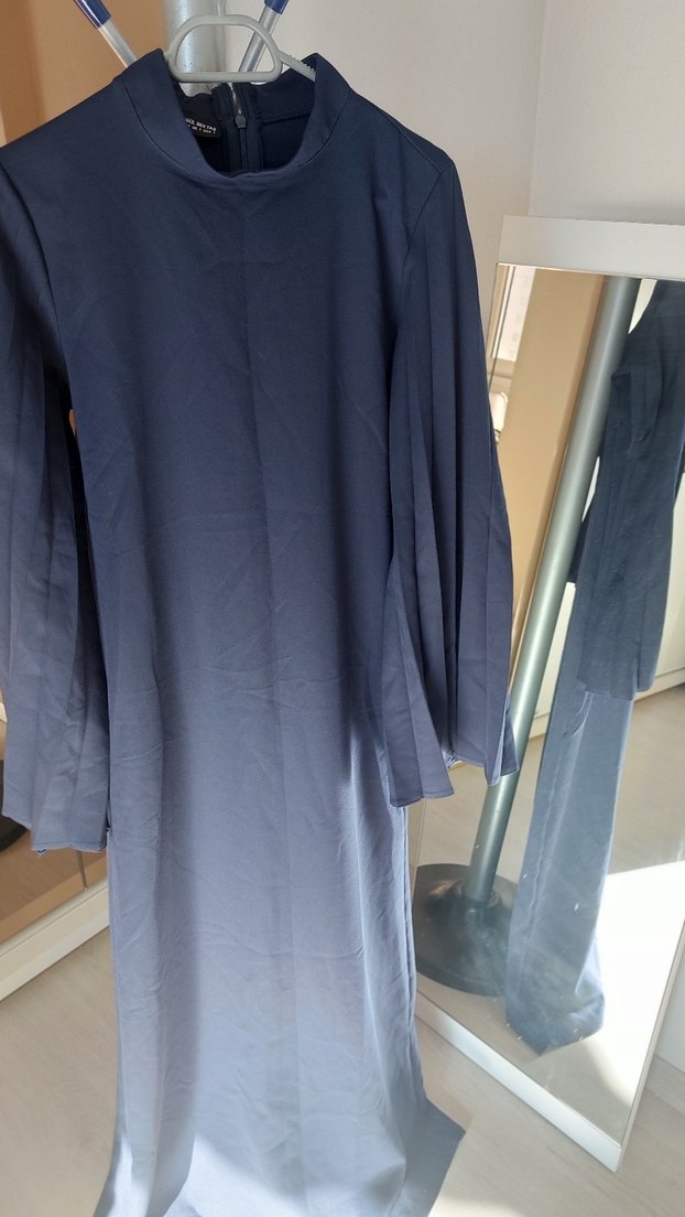 Lacivert uzun elbise, salaş kesim ve uzun kollu. İpeksi kumaştan, yuvarlak yaka ve drapeli tasarıma sahip,
