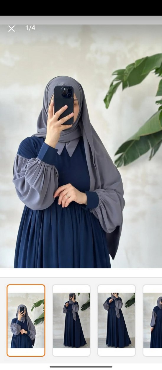 Yüksek yakalı, salaş kesim uzun elbise, düz mavi renkte ve drapeli uzun kolludur. Pürüzsüz sentetik kumaştan, sade ve günlük kullanıma uygundur.