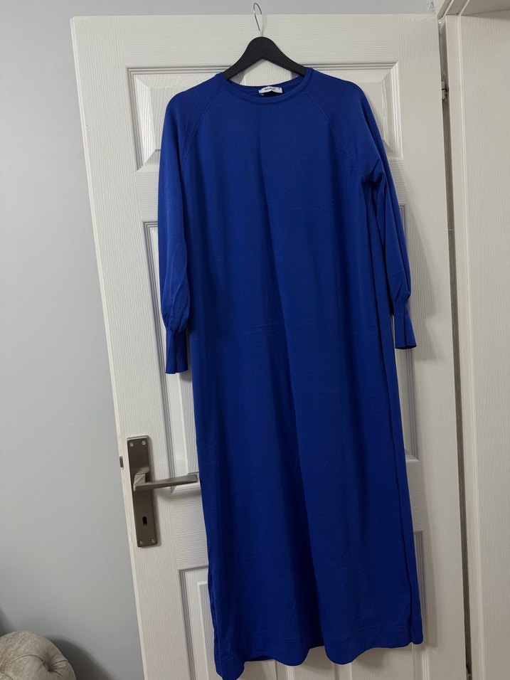 Uzun kollu, salaş kesim mavi elbise, yuvarlak yaka ve drapeli tasarıma sahiptir. Yumuşak ve sıcak kumaştan üretilmiştir, günlük kullanıma uygundur.