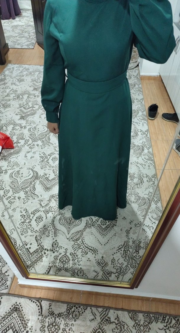 Uzun, salaş kesim, drapeli ve yuvarlak yakalı elbise. Koyu yeşil, sentetik kumaştan, minimalist ofis tarzına uygun.