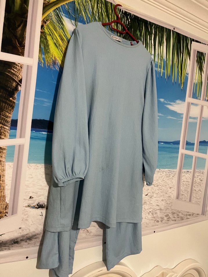 Yumuşak keten kumaştan, uzun kollu ve salaş kesimli bu mavi tunik, drapeli ,1 kez kullanıldı yepyeni