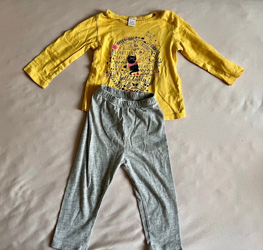 Uzun kollu sarı baskılı üst ve yumuşak gri pantolondan oluşan bebek kız takımı, rahatlık ve şıklığı bir arada sunar.