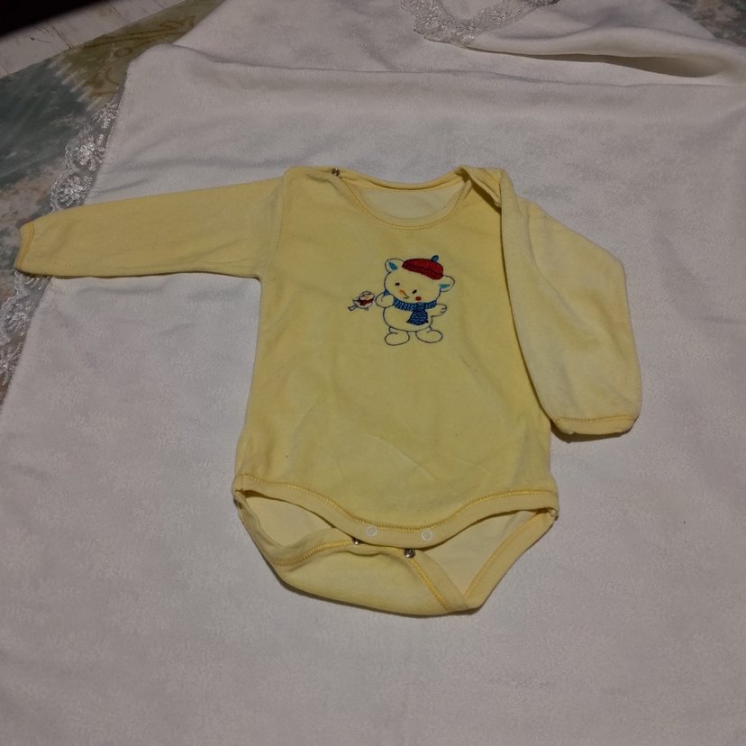 Uzun kollu sarı bebek body, renkli ayıcık baskılıdır. Yuvarlak yaka ve düğmeli kapanışa sahiptir.
