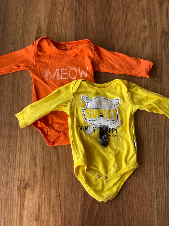 Uzun kollu, yuvarlak yaka, renkli baskılı sarı bebek body. Yumuşak ve sıcak kumaş, cırt cırtlı kapanış ve eğlenceli kedi deseni içerir. İkili zıbın body