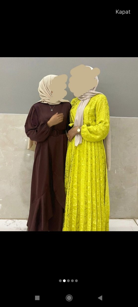 Uzun kollu, yüksek yakalı sarı elbise, bol ve drapeli kesimiyle bohem ve tesettür tarzına uygundur. Desenli yapısıyla düğünler için idealdir.
