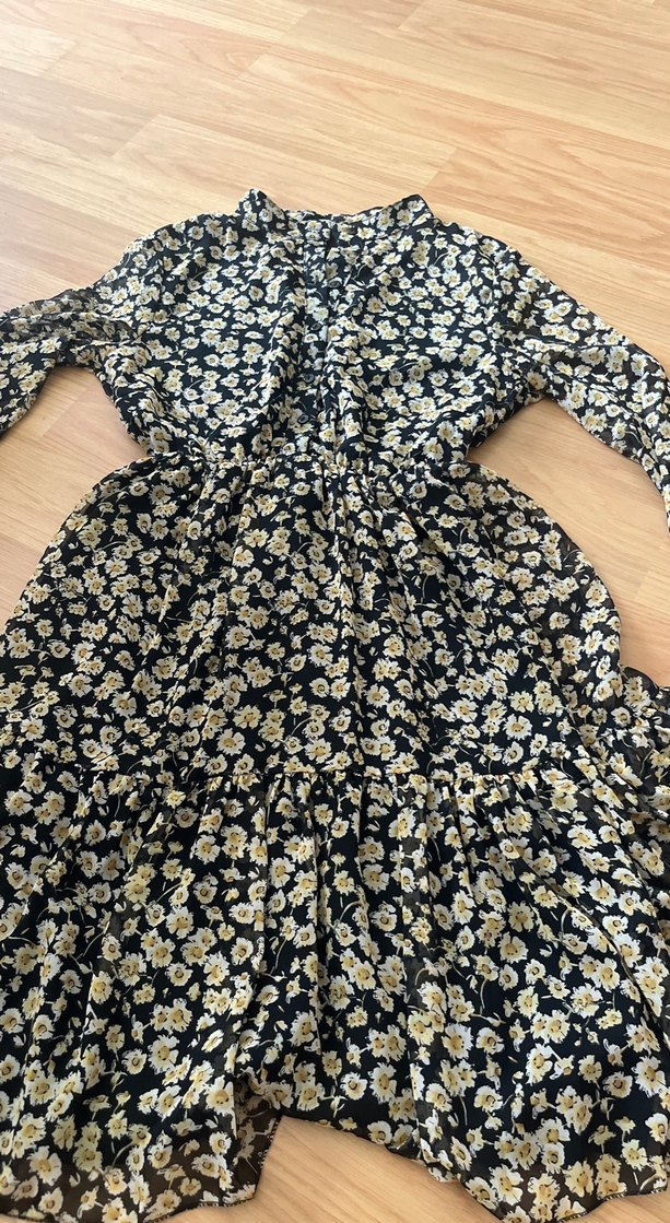 Uzun, bol kesim elbise, koyu sarı çiçekli desenli, V yaka ve düğmeli ön detaylıdır. Uzun kollu, bohem tarzda ve sentetik kumaştan yapılmıştır.