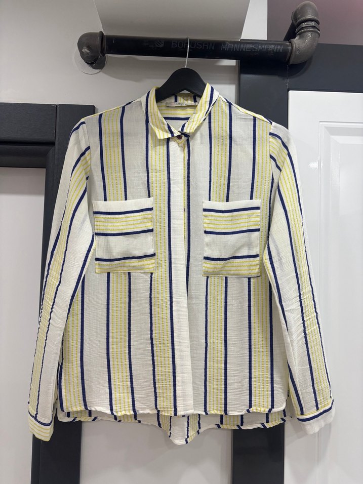 Uzun kollu, yakalı ve düğmeli ön kısmı olan, sarı çizgili kumaştan yapılmış, iki ön cepli gömlek.