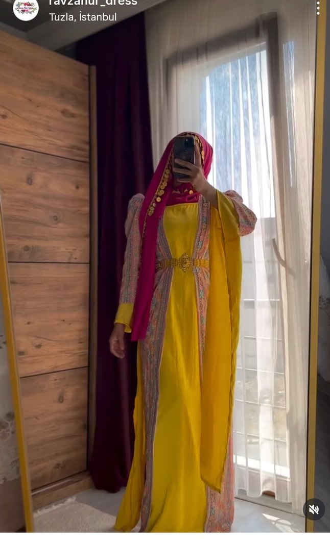 Uzun kollu, yüksek yakalı sarı elbise, ipeksi kumaş ve etnik desenlerle. Drapeli tasarım ve rahat kesimle, mütevazı tarza ve düğünlere uygun.