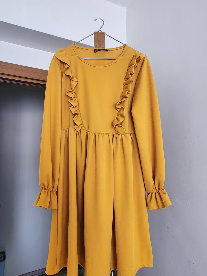Uzun kollu, bol kesim sarı tunik, ön ve manşetlerde fırfır detaylı, yumuşak sentetik kumaştan. Yuvarlak yaka ve parlak dokusu ile bohem tarzına uygun. Kusuru yoktur çok az giyildi tertemiz duruyor kumaşı güzel duruşu da baya güzel S beden ama esnek kumaşlı oldugu icin m l de olur