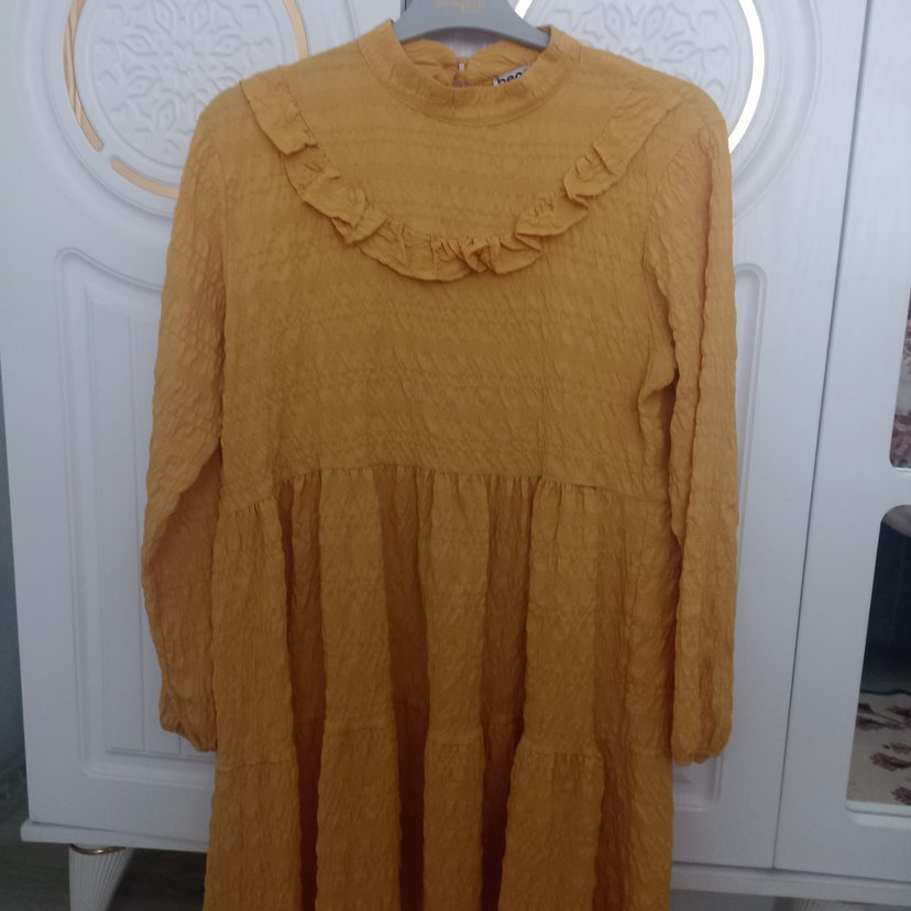 Yumuşak keten kumaştan, parlak sarı renkte, uzun ve bol kesim bir tuniktir. Uzun kollu, yuvarlak yaka ve göğüs kısmında fırfır detayı bulunur.