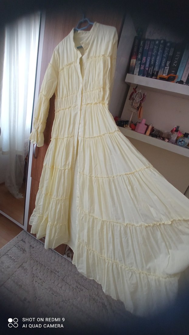 Uzun kollu, yüksek yakalı sarı keten elbise, pilili detaylara sahip ve bol kesimdir. Bohem tarzıyla günlük kullanıma uygundur. gezmede Nisan'da düğünde her yerde asıl ve şik by bukeden aldim