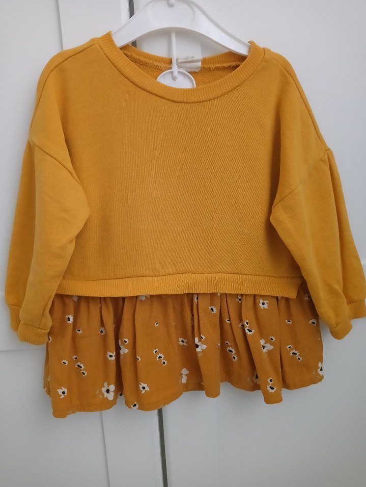 Uzun kollu, salaş kesim sarı kız çocuk elbise, fırfırlı desenli etek kısmı ve yuvarlak yakaya sahiptir. Yumuşak ve sıcak kumaştan üretilmiştir.