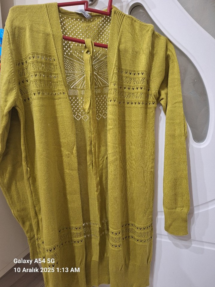 Uzun kollu, bol kesim sarı hırka, nakış detayları ve V yaka ile örgü kumaştan yapılmıştır. Rahat ve bohem tarzda bir parça.
