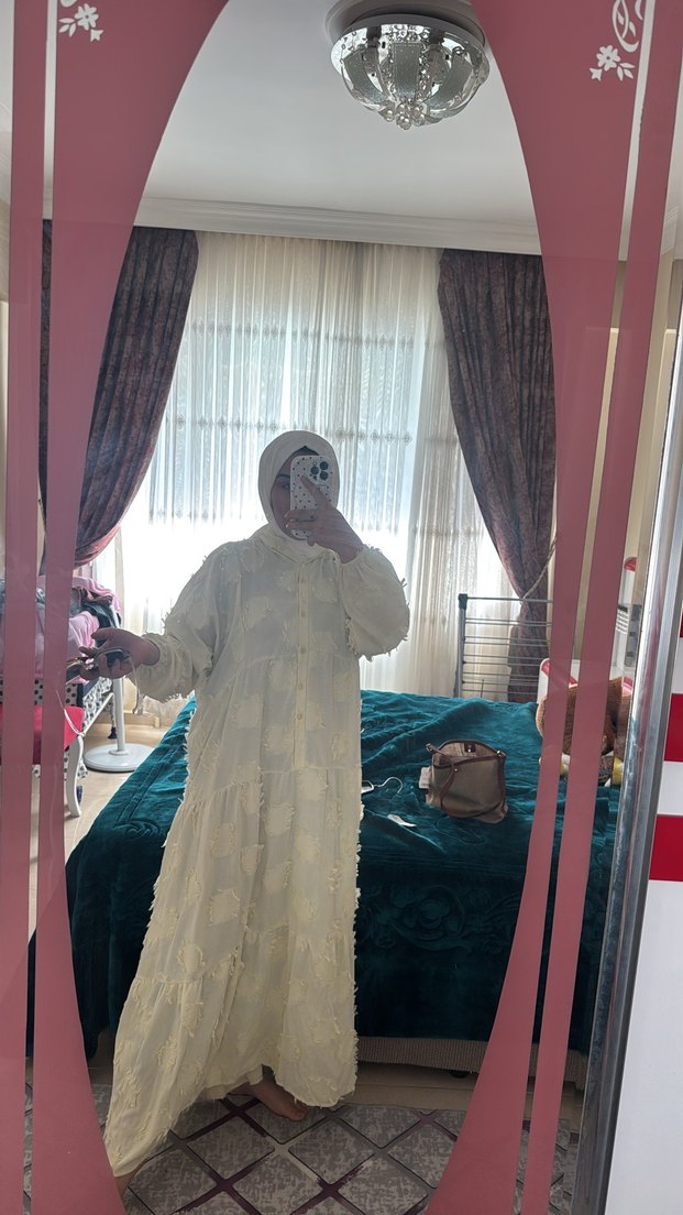 Ürün temiz bir kere giyindi Yüksek yakalı, uzun kollu, bol kesim beyaz pamuklu elbise. Hafif tie-dye desenli, şeffaf bohem tarzında, günlük kullanıma uygun mütevazı model.