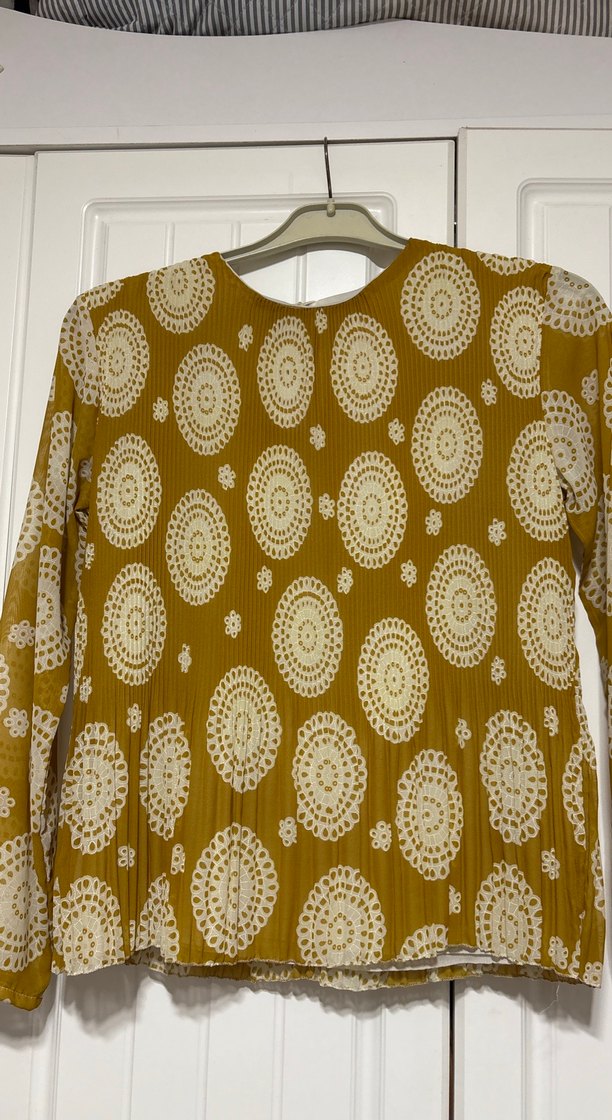 Uzun kollu, yuvarlak yakalı, pileli dokusu ve açık sarı batik deseniyle bohem tarzda bol kesim bluz.