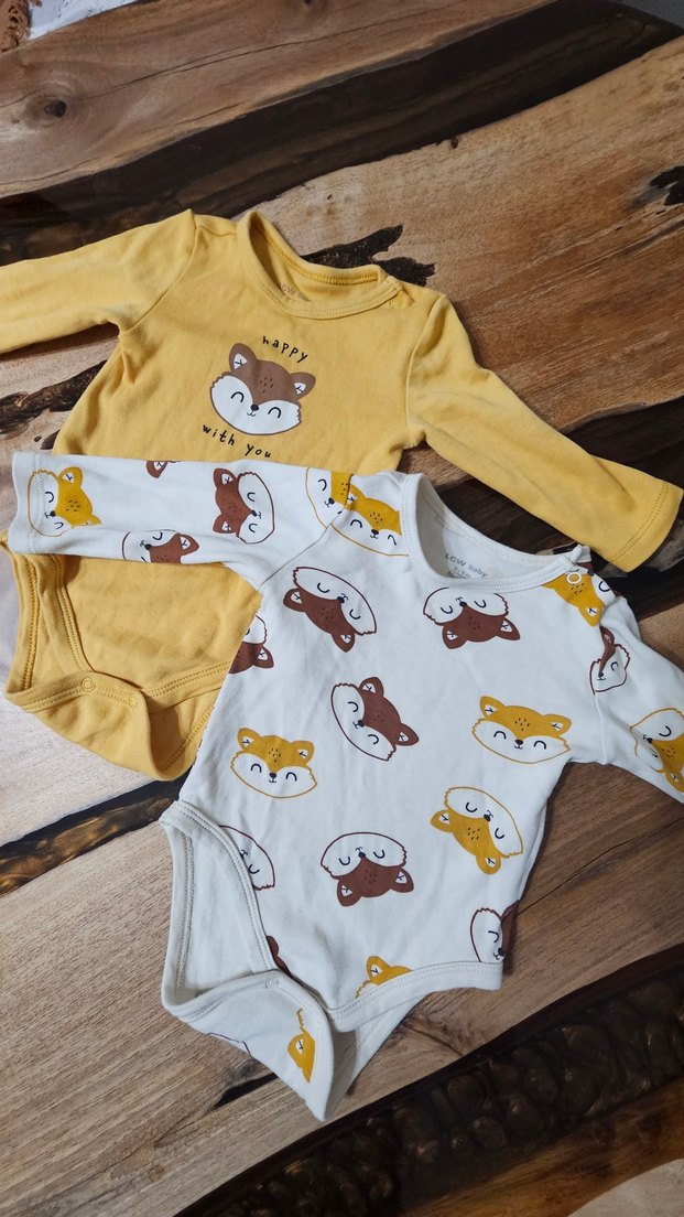 Yumuşak pamuklu kumaştan yapılmış, uzun kollu iki bebek body. Biri sarı renkli, tilki baskılı ve 'happy with you' yazılı, diğeri beyaz ve tilki yüzü desenli. Her ikisi de yuvarlak yakalı ve örme dokuda. 2 si beraber gönderilecek 3-6 ay tertemiz