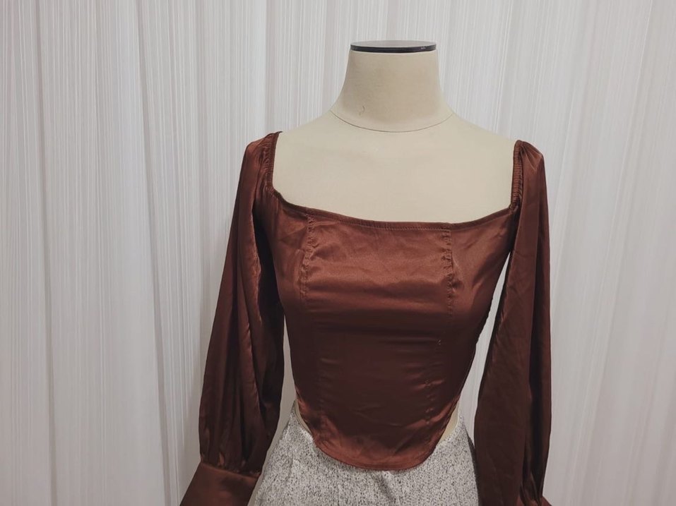 Bu kahverengi bluz, tekne yaka ve uzun kolludur. Saten parlak kumaştan, drapeli ve vintage bohem tarzındadır, günlük kullanıma uygundur.