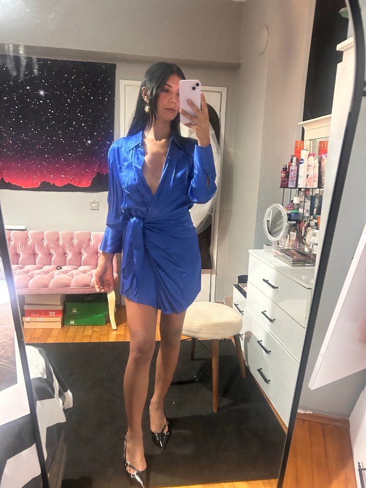 Uzun kollu, V yakalı ve parlak mavi ipeksi kumaştan, transparan detaylı, vücuda oturan mini elbisedir. Romantik akşamlar için uygundur.