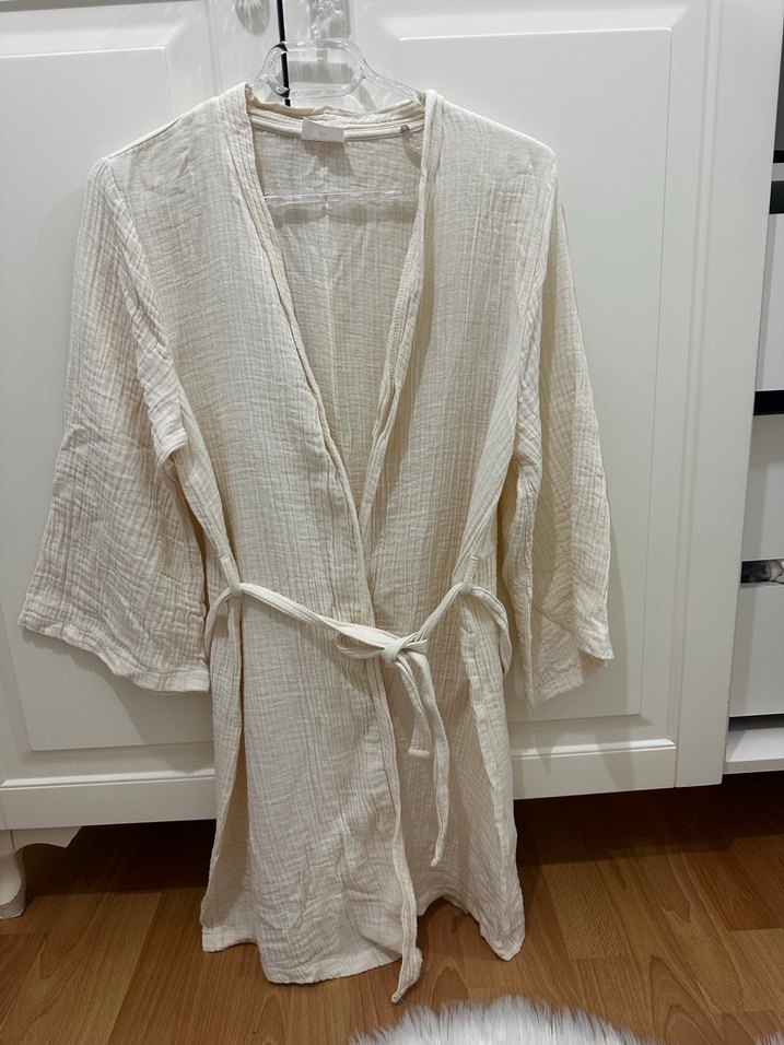 Uzun kollu, bol kesim ve V yakalı beyaz emzirme sabahlığı. Hafif, yumuşak kumaştan, uzun boylu ve ayarlanabilir bağcıklı.