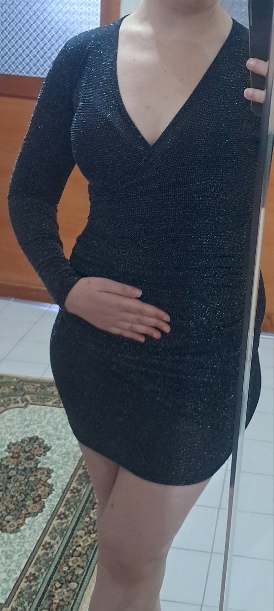 Uzun kollu, V yakalı siyah midi elbise, simli detaylarla dikkat çeker. Cesur ve göz alıcı parti tarzı için uygundur. ✨