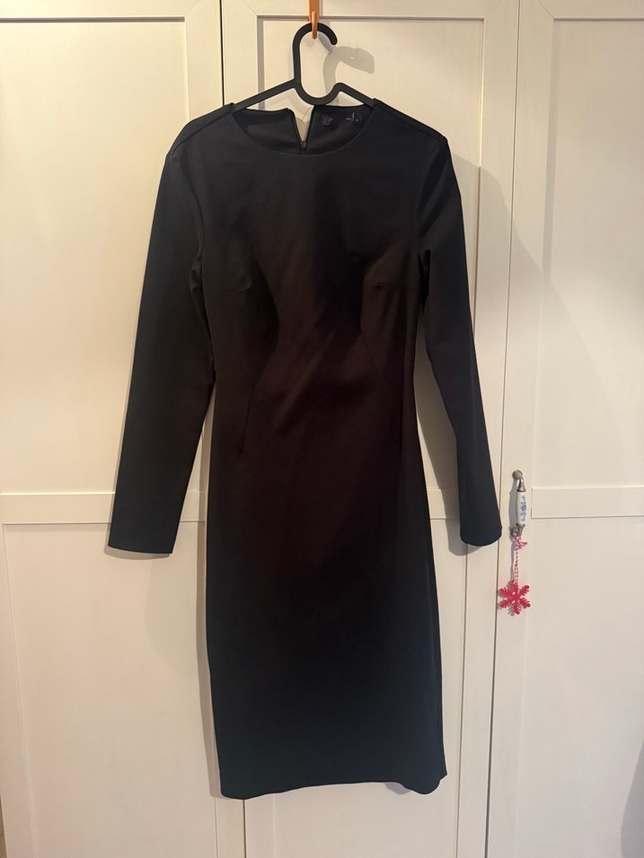 Bu siyah, uzun kollu, yüksek yakalı ve yırtmaçlı midi elbise, ofis şıklığıyla buluşturuyor.