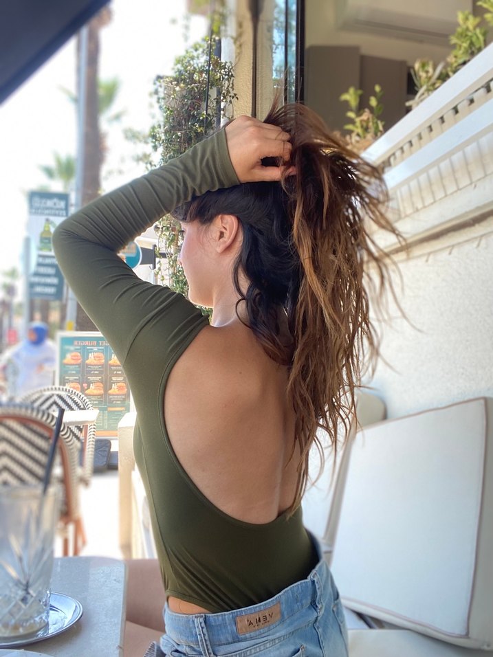 Haki renkli, uzun kollu ve geniş sırt açıklıklı bu bluz, rahat ve şık bir tasarım sunar.