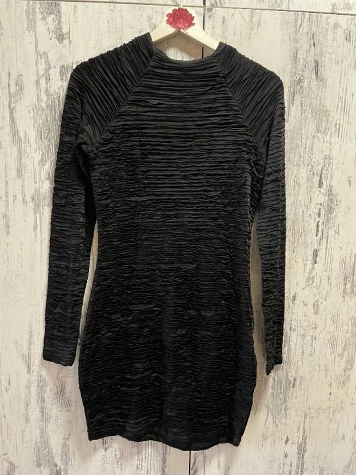 Bu siyah, uzun kollu, pilili ve uzun boylu abiye elbise, yüksek yakası ve dar kesimiyle gotik tarzda romantik akşamlar için uygundur.