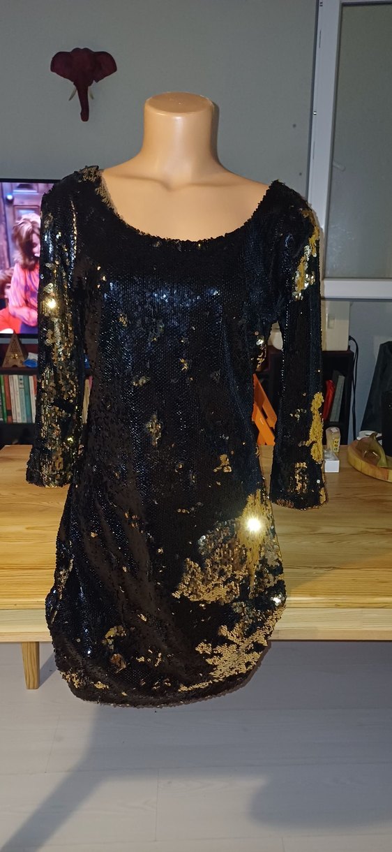 Uzun kollu, yuvarlak yakalı ve vücuda oturan midi elbise, siyah ve altın payetlerle desenli, gösterişli bir parti kıyafeti için uygun. ✨