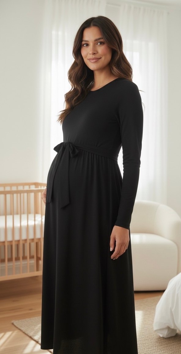 Uzun kollu, bisiklet yakalı siyah hamile elbise, vücuda oturan kesimiyle sade ve minimal goth tarzını yansıtır. Günlük kullanıma uygundur.