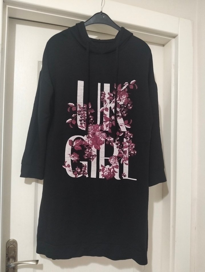Siyah midi sweatshirt, yüksek yakalı ve uzun kollu, bol kesimdir. Ön kısmında çiçek baskısı vardır, sentetik kumaştan yapılmıştır.