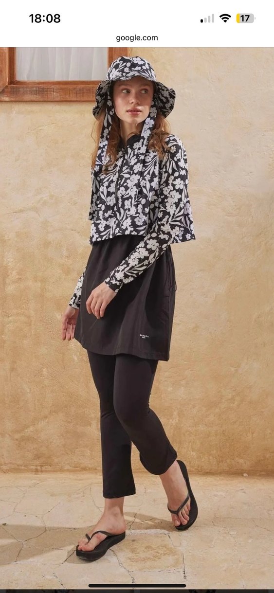 Gevşek kesim, uzun kollu siyah batik desenli, drapeli haşema. 1 defa giyildi Manuka marka haşema üst alt ve bonesi dahildir