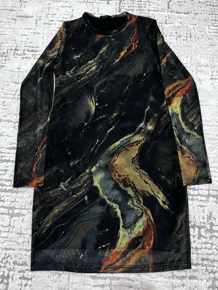 Uzun kollu, yüksek yakalı ve dökümlü tasarıma sahip, siyah batik desenli, sentetik kumaştan yapılmış dar kesim kadın tunik. Avant-garde sokak stili için uygundur. Adet satılır