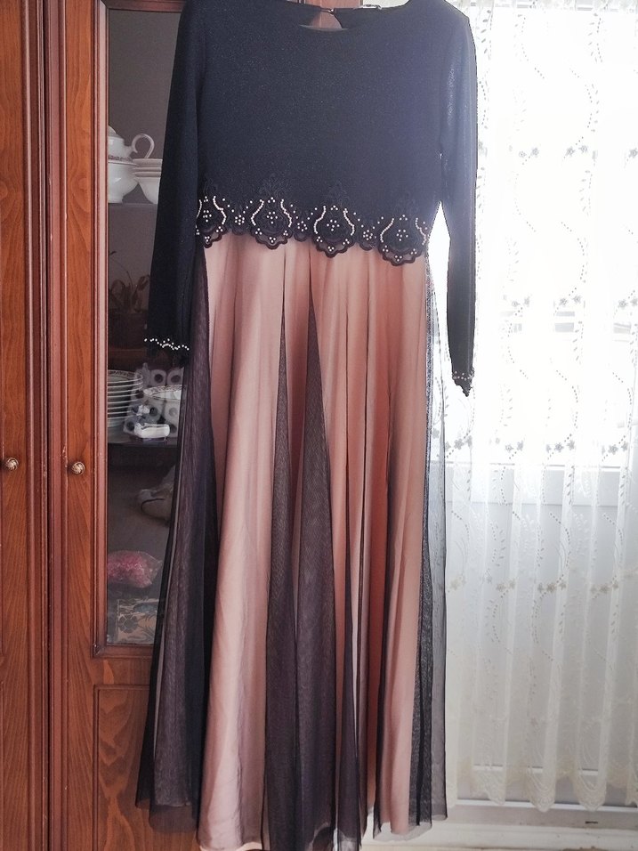 Uzun kollu, yuvarlak yakalı, siyah üst kısmı dantel detaylı ve bej etekli, bol kesim abiye elbise. Düğünler için uygun şık bir parça.