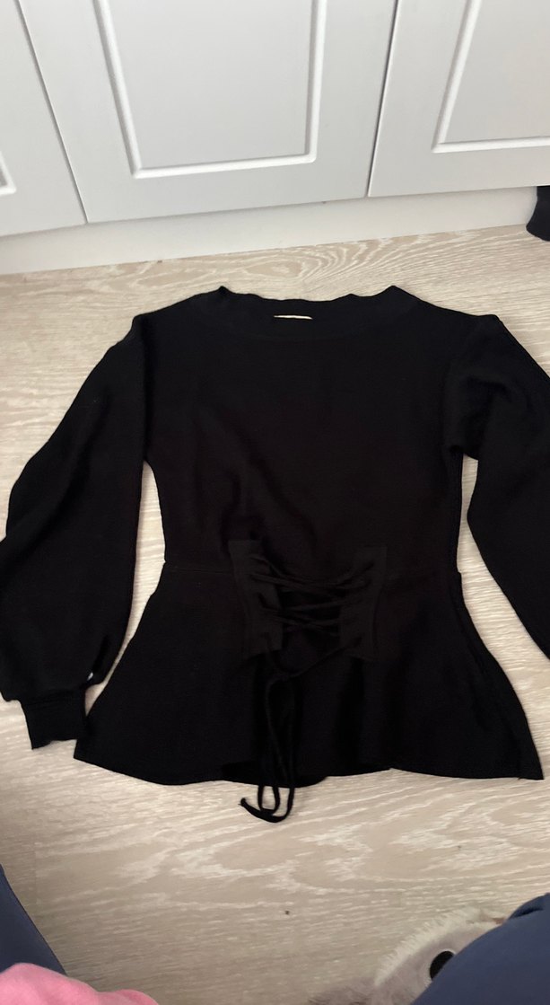 Bu siyah bluz, uzun kollu ve yuvarlak yakalı olup, bel kısmında bağcıklı detay içerir. Gotik tarzda, midi boyda ve sentetik kumaştandır.