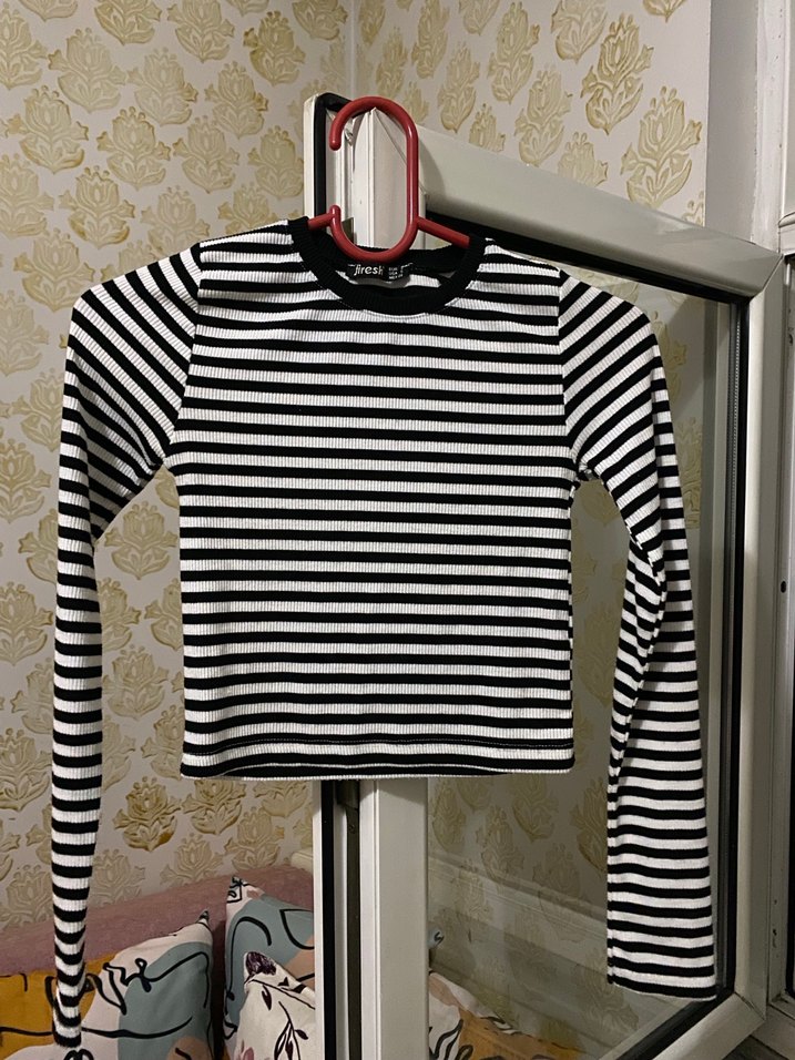 Dar kesim, uzun kollu siyah beyaz çizgili crop top. Yüksek yakalı, örme sentetik kumaştan, gündelik sokak stiline uygun.