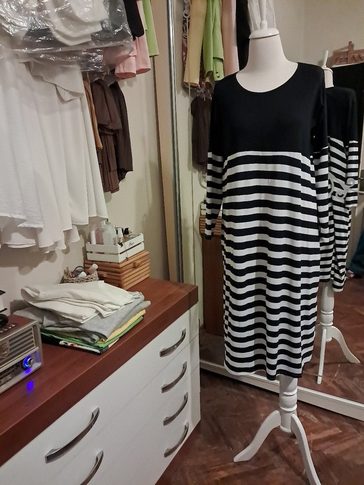 Pamuk kumaştan, uzun kollu ve salaş kesim siyah beyaz çizgili hamile elbisesi. Kayık yaka ve pile detaylarıyla günlük rahatlık sunar.