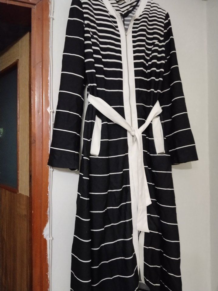 Uzun Kollu Siyah Beyaz Çizgili Kadın Bornoz