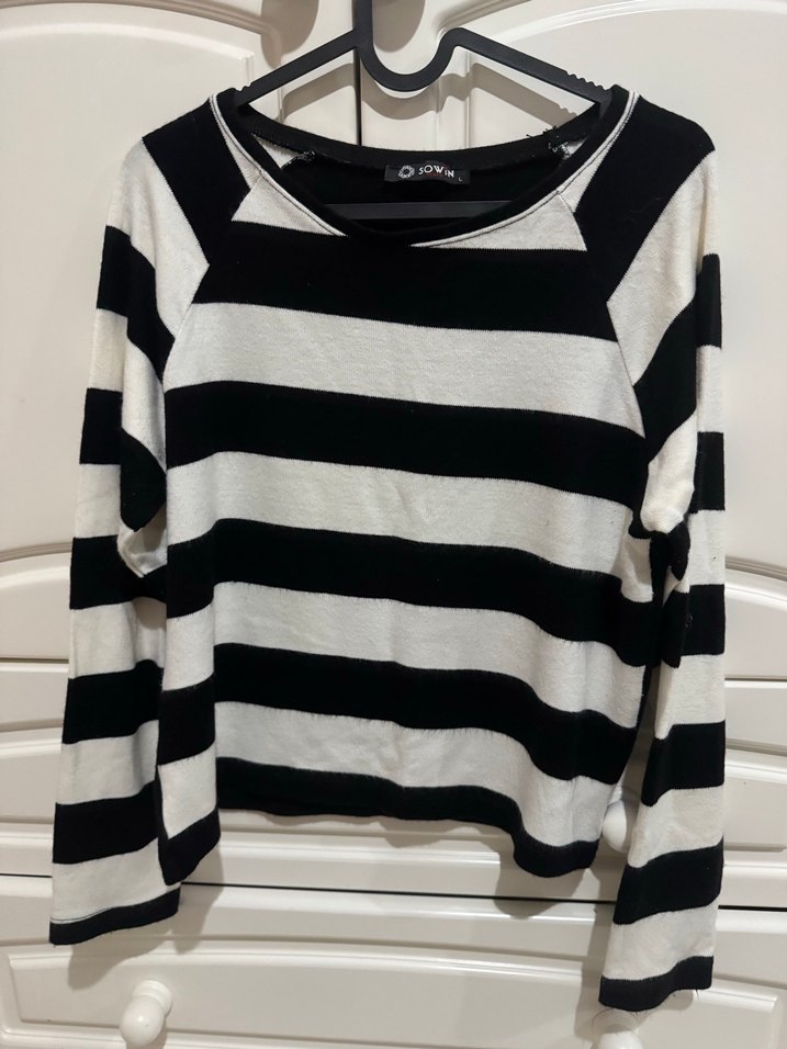 Gevşek kesim, uzun kollu ve kayık yaka kadın kazak. Yumuşak pamuktan örülmüş, siyah beyaz çizgili desene sahip, rahat sokak stili için uygun.
