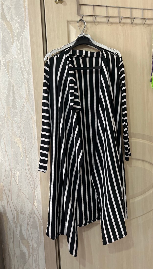 Uzun kollu, siyah beyaz çizgili kadın sabahlık, regular fit ve Paris sokak modasına uygun tarzda tasarlanmıştır.