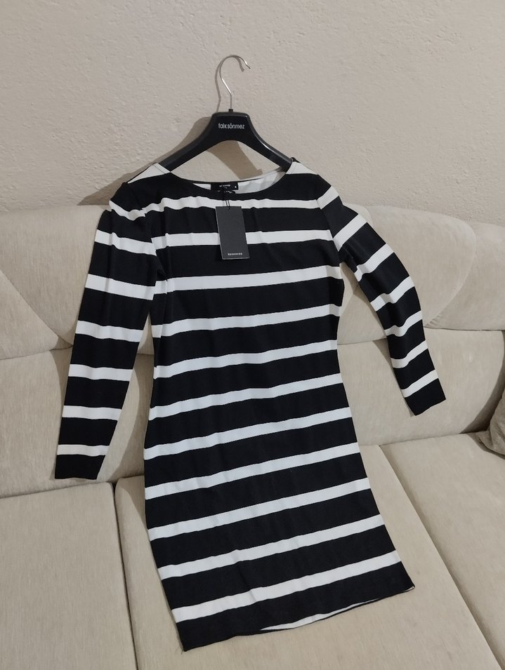 Uzun kollu, tekne yaka, siyah beyaz yatay çizgili, sentetik kumaştan yapılmış, günlük kullanıma uygun dar kesim midi elbise.