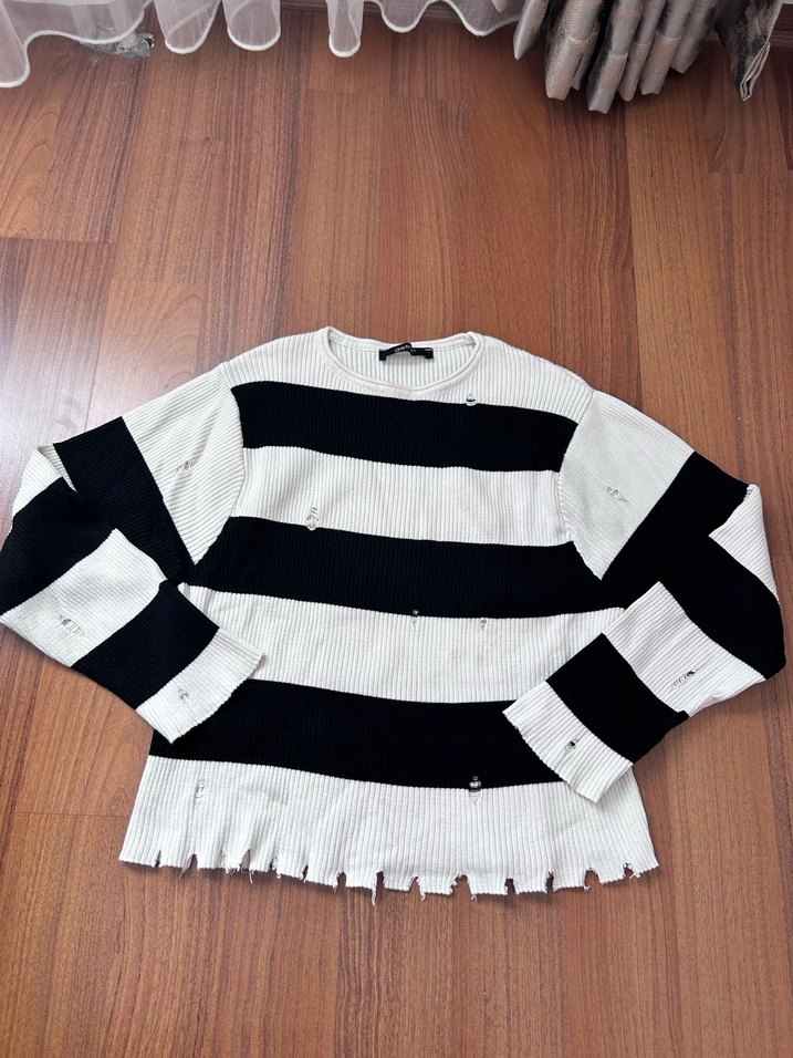 Uzun kollu, yuvarlak yakalı, siyah beyaz yatay çizgili, gevşek kesim örgü kazak. Alt ve kollarda yıpranmış detaylarla grunge punk tarzında, trend günlük stil için uygundur.