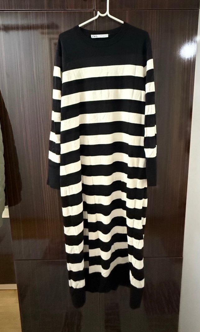 Uzun kollu, salaş kesim ve tekne yaka detaylı siyah beyaz çizgili triko elbisedir. Yumuşak sentetik kumaştan üretilmiş, drapeli tasarıma sahiptir. Günlük kullanım için uygundur.