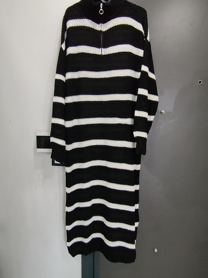 Yüksek yakalı, uzun kollu, siyah beyaz çizgili triko elbise. Salaş kesimi ve rahat yapısıyla gündelik kullanıma uygun goth tarzı.